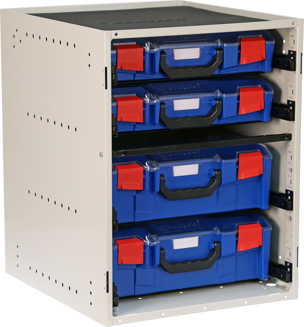 Cabinet comes completely assembled and packaged with protective foam in corners for shipping. All cases have a Clear Ultra High Strength PC Lid as standard and not ABS as others.  Quality welded cabinets with Matt Grey Powder Coating. Dual rear rubber bumpers on all drawers to minimise rattle in a vehicle also ensuring firmer locking. All cases are compatible with Rolacase and other leading brands. Our cases fit into other popular brands and theirs can fit into our empty cabinets. Features include all cases can be individually locked, label provided on front to allow easy identification, ergonomically designed carry handle, complete with 3 large dividers with removable tote tray in large case and  9 dividers in small case, superior firm fiberglass reinforced locking clasp on front and visually styled outlook providing a true tradesman carry and storage case for all their parts. Suitable for Electricians, Plumbers, Data Cable installers, Mechanics and many others in business, office, workshop or at home.  Our new range also come with a rubber mat allowing top of cabinet to be used as a work platform base. All cabinets come with L shaped mounting feet and appropriate hardware to secure in a van or onto a workbench or even under a workbench.